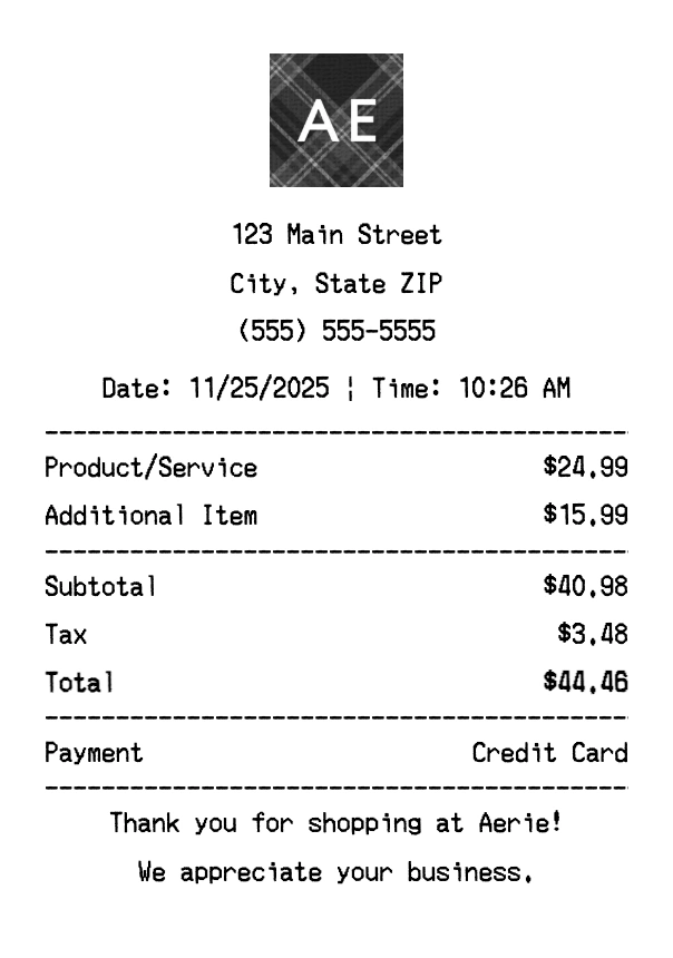 Create authentic Aerie receipts instantly. Our free receipt generator produces professional apparel receipts with company logo, itemized purchases, tax calculations, and payment details. Perfect for expense tracking, reimbursement, and documentation. Download high-quality PNG receipts in seconds.