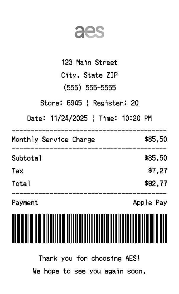Our AES receipt generator creates professional receipts that match the authentic AES format. Each receipt includes the company logo, business information, transaction details, itemized purchase list, tax calculations, and payment information. All receipts are formatted to look exactly like real AES receipts, making them perfect for expense reports, tax documentation, and reimbursement purposes.