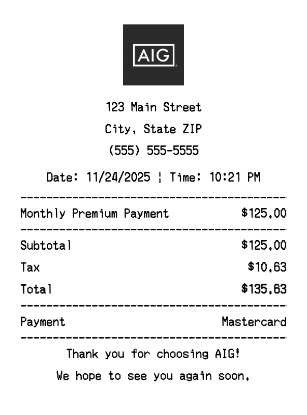 Create authentic AIG receipts instantly. Our free receipt generator produces professional insurance receipts with company logo, itemized purchases, tax calculations, and payment details. Perfect for expense tracking, reimbursement, and documentation. Download high-quality PNG receipts in seconds.