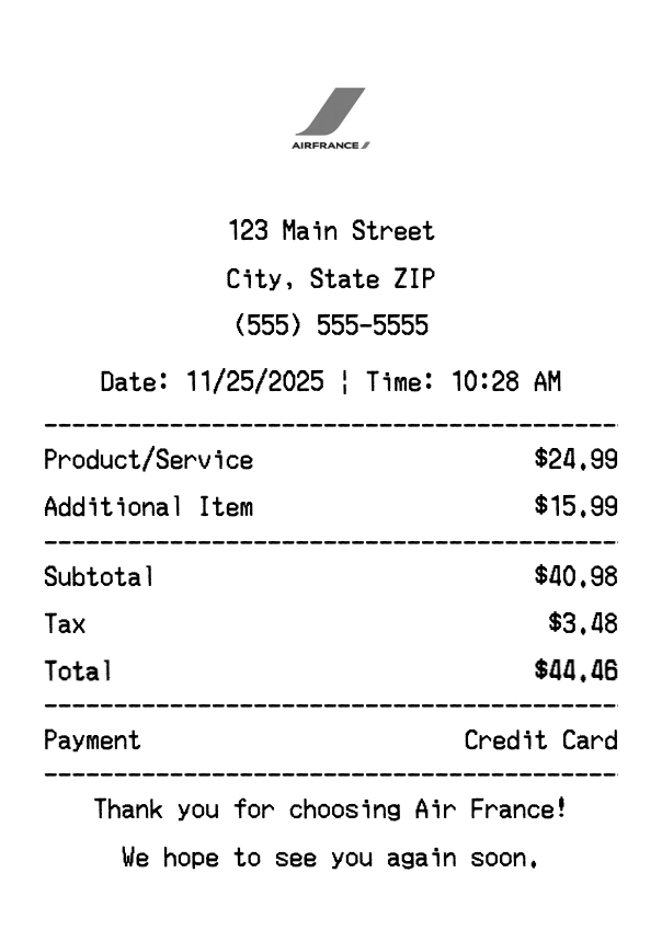 Create authentic Air France receipts instantly. Our free receipt generator produces professional airlines receipts with company logo, itemized purchases, tax calculations, and payment details. Perfect for expense tracking, reimbursement, and documentation. Download high-quality PNG receipts in seconds.