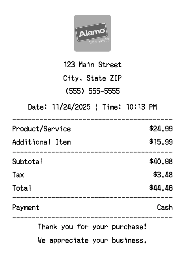 Our Alamo receipt generator creates professional receipts that match the authentic Alamo format. Each receipt includes the company logo, business information, transaction details, itemized purchase list, tax calculations, and payment information. All receipts are formatted to look exactly like real Alamo receipts, making them perfect for expense reports, tax documentation, and reimbursement purposes.
