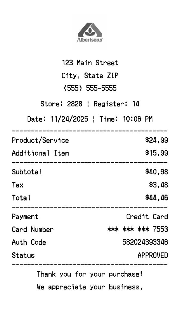 Our Albertsons receipt generator creates professional receipts that match the authentic Albertsons format. Each receipt includes the company logo, business information, transaction details, itemized purchase list, tax calculations, and payment information. All receipts are formatted to look exactly like real Albertsons receipts, making them perfect for expense reports, tax documentation, and reimbursement purposes.