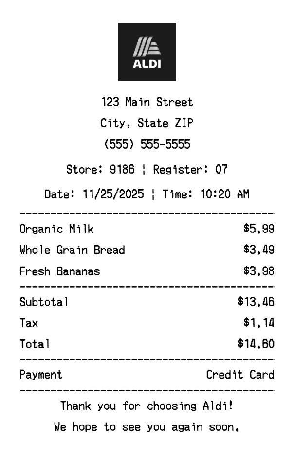 Create authentic Aldi receipts for grocery store purchases. Our free receipt generator tool helps you create professional, detailed receipts instantly. Perfect for business expense tracking, reimbursement requests, and personal documentation. Download high-quality PNG receipts in seconds, no signup required.