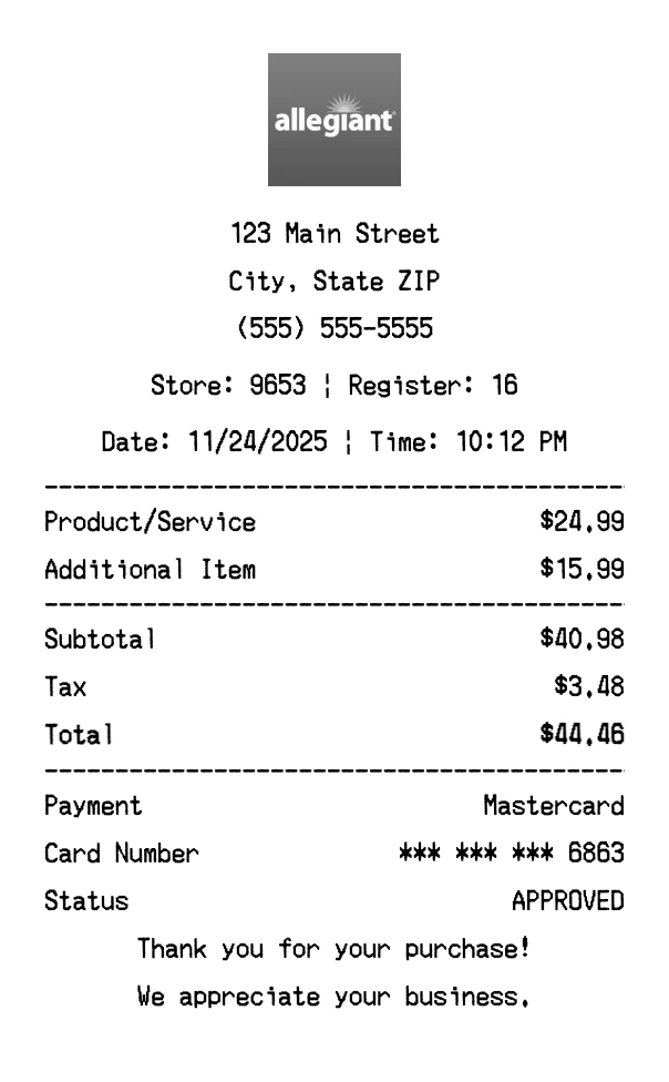 Create authentic Allegiant Air receipts instantly. Our free receipt generator produces professional airline receipts with company logo, itemized purchases, tax calculations, and payment details. Perfect for expense tracking, reimbursement, and documentation. Download high-quality PNG receipts in seconds.