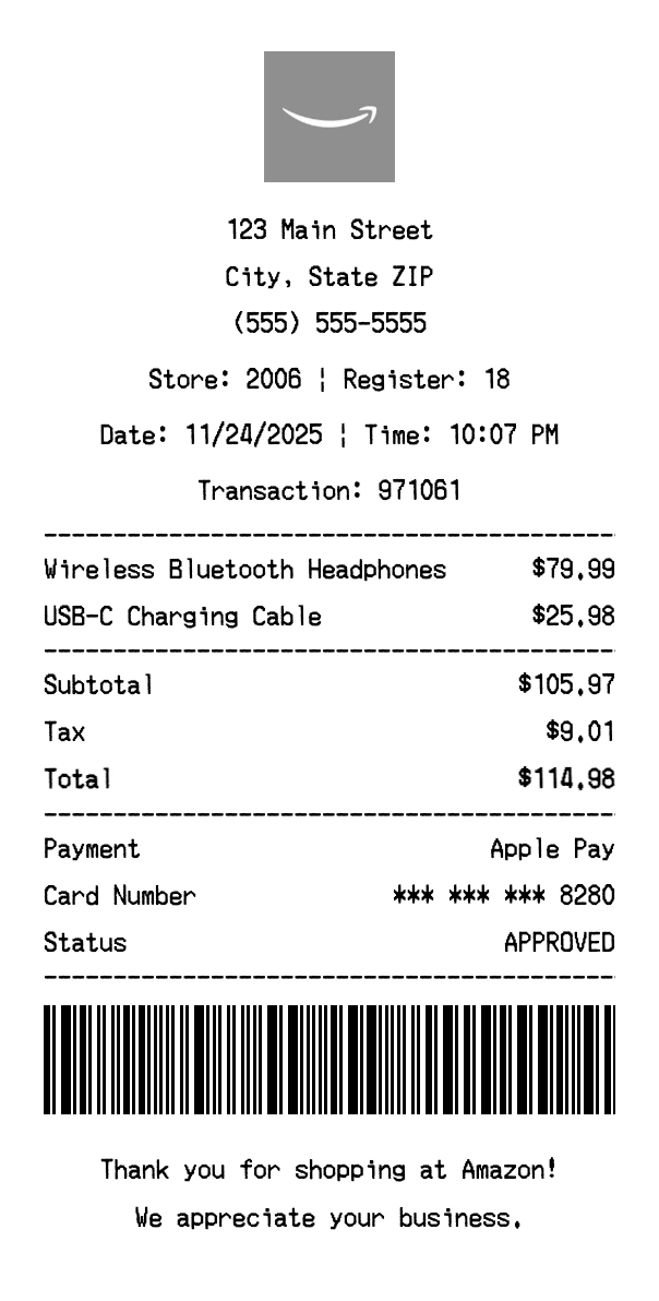 Create authentic Amazon receipts for all your Amazon purchases - including e-commerce orders, Amazon Prime Video streaming, Amazon Music and Amazon Music Unlimited subscriptions, and Amazon Logistics shipping services. Our free receipt generator tool helps you create professional, detailed receipts instantly. Perfect for business expense tracking, reimbursement requests, and personal documentation. Download high-quality PNG receipts in seconds, no signup required.
