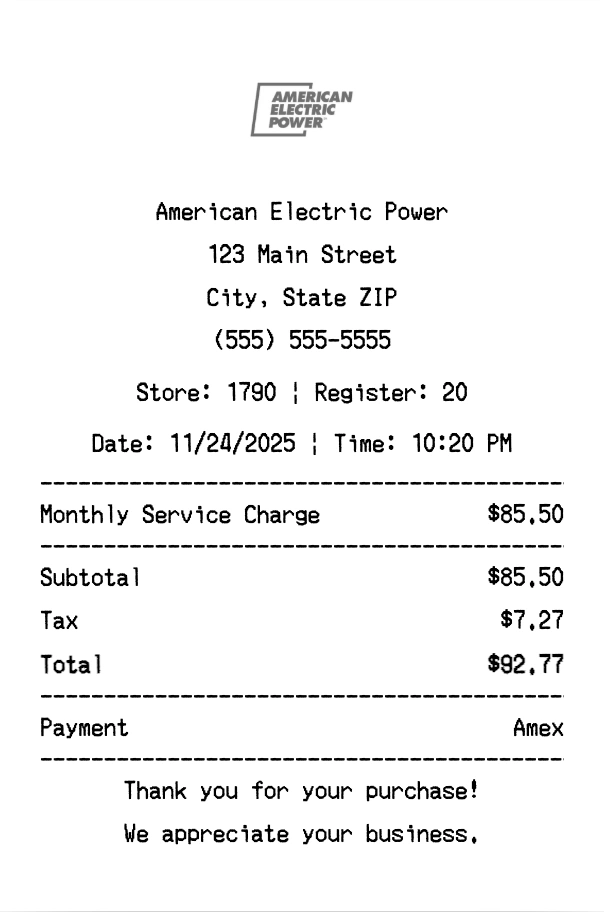Create authentic American Electric Power receipts instantly. Our free receipt generator produces professional energy receipts with company logo, itemized purchases, tax calculations, and payment details. Perfect for expense tracking, reimbursement, and documentation. Download high-quality PNG receipts in seconds.
