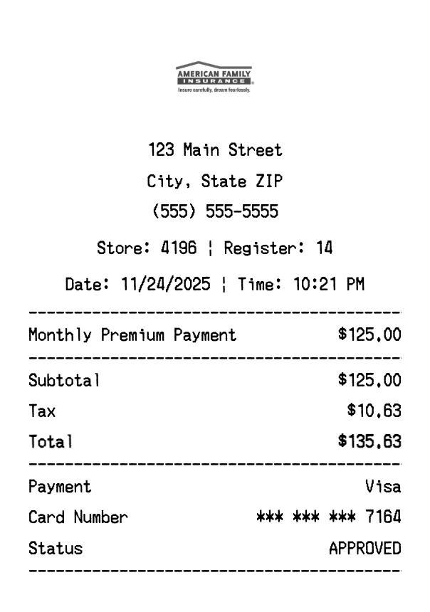 Create authentic American Family Insurance receipts for insurance purchases. Our free receipt generator tool helps you create professional, detailed receipts instantly. Perfect for business expense tracking, reimbursement requests, and personal documentation. Download high-quality PNG receipts in seconds, no signup required.