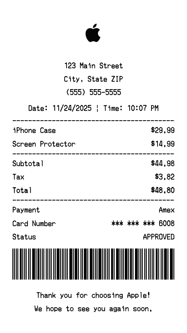 Create authentic Apple receipts for all your Apple purchases - including Apple Store retail purchases, Apple Music streaming subscriptions, Apple Pay transactions, Apple TV+ streaming, and Apple iTunes purchases. Our free receipt generator tool helps you create professional, detailed receipts instantly. Perfect for business expense tracking, reimbursement requests, and personal documentation. Download high-quality PNG receipts in seconds, no signup required.
