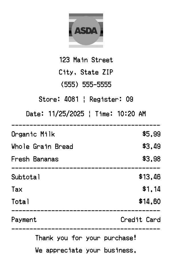 Create authentic Asda receipts instantly. Our free receipt generator produces professional grocery store receipts with company logo, itemized purchases, tax calculations, and payment details. Perfect for expense tracking, reimbursement, and documentation. Download high-quality PNG receipts in seconds.