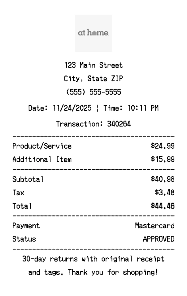 Our At Home receipt generator creates professional receipts that match the authentic At Home format. Each receipt includes the company logo, business information, transaction details, itemized purchase list, tax calculations, and payment information. All receipts are formatted to look exactly like real At Home receipts, making them perfect for expense reports, tax documentation, and reimbursement purposes.