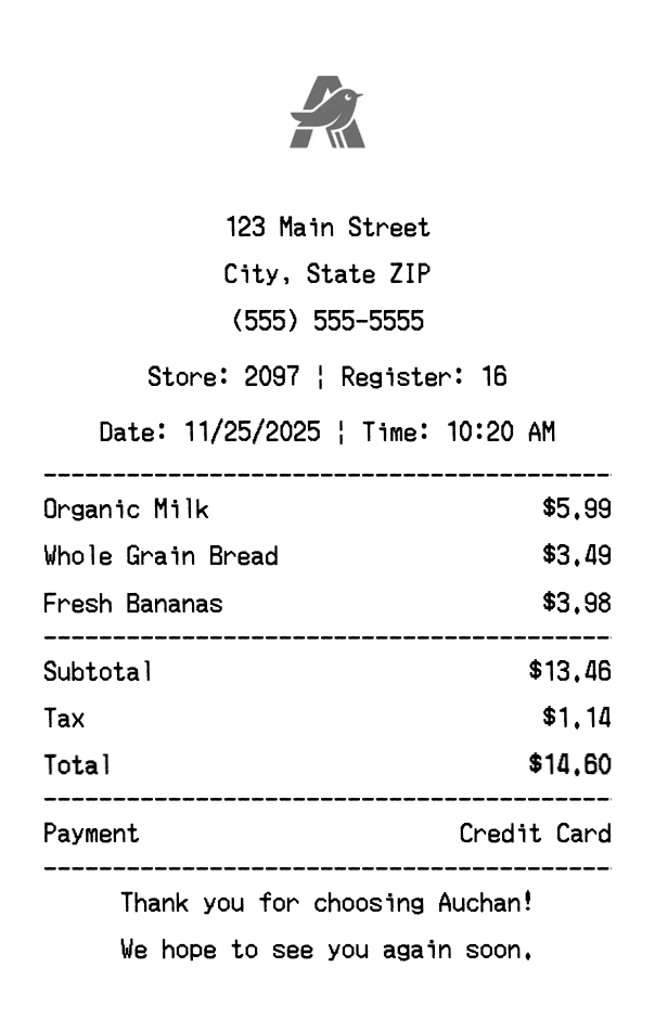Create authentic Auchan receipts instantly. Our free receipt generator produces professional grocery store receipts with company logo, itemized purchases, tax calculations, and payment details. Perfect for expense tracking, reimbursement, and documentation. Download high-quality PNG receipts in seconds.