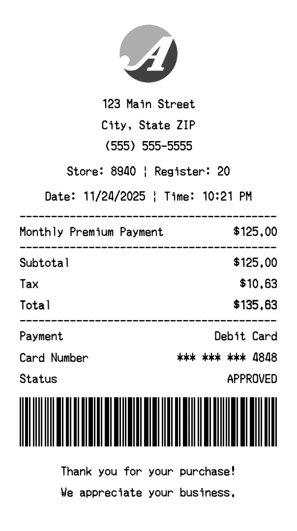 Our Auto-Owners Insurance receipt generator creates professional receipts that match the authentic Auto-Owners Insurance format. Each receipt includes the company logo, business information, transaction details, itemized purchase list, tax calculations, and payment information. All receipts are formatted to look exactly like real Auto-Owners Insurance receipts, making them perfect for expense reports, tax documentation, and reimbursement purposes.