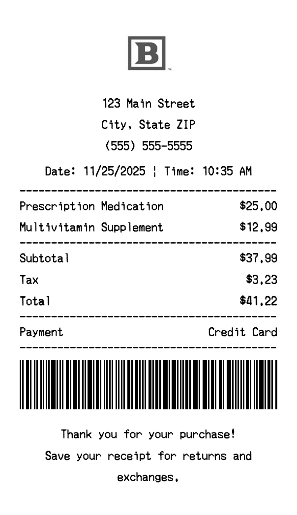 Create authentic Bartell Drugs receipts for pharmacy purchases. Our free receipt generator tool helps you create professional, detailed receipts instantly. Perfect for business expense tracking, reimbursement requests, and personal documentation. Download high-quality PNG receipts in seconds, no signup required.