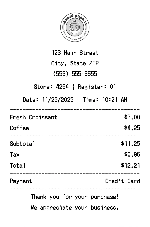 Create authentic Beard Papa's receipts for bakery purchases. Our free receipt generator tool helps you create professional, detailed receipts instantly. Perfect for business expense tracking, reimbursement requests, and personal documentation. Download high-quality PNG receipts in seconds, no signup required.