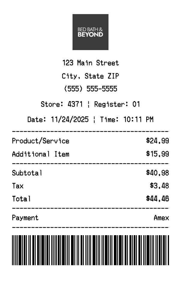Create authentic Bed Bath & Beyond receipts for home goods purchases. Our free receipt generator tool helps you create professional, detailed receipts instantly. Perfect for business expense tracking, reimbursement requests, and personal documentation. Download high-quality PNG receipts in seconds, no signup required.