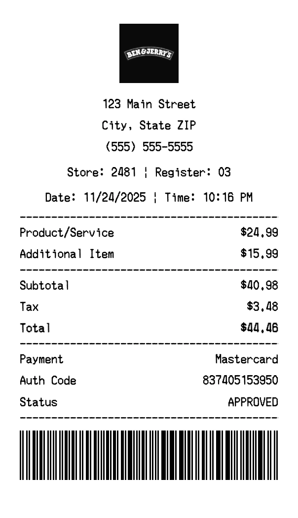 Create authentic Ben & Jerry's receipts for ice cream purchases. Our free receipt generator tool helps you create professional, detailed receipts instantly. Perfect for business expense tracking, reimbursement requests, and personal documentation. Download high-quality PNG receipts in seconds, no signup required.