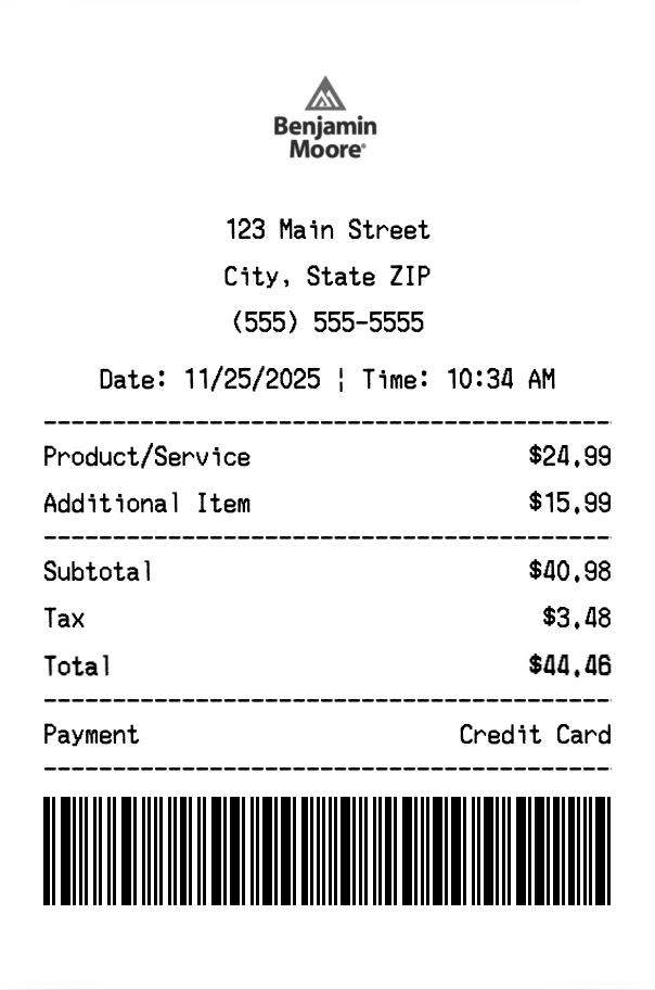 Create authentic Benjamin Moore receipts for paint purchases. Our free receipt generator tool helps you create professional, detailed receipts instantly. Perfect for business expense tracking, reimbursement requests, and personal documentation. Download high-quality PNG receipts in seconds, no signup required.