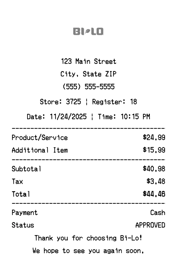 Create authentic Bi-Lo receipts instantly. Our free receipt generator produces professional grocery store receipts with company logo, itemized purchases, tax calculations, and payment details. Perfect for expense tracking, reimbursement, and documentation. Download high-quality PNG receipts in seconds.