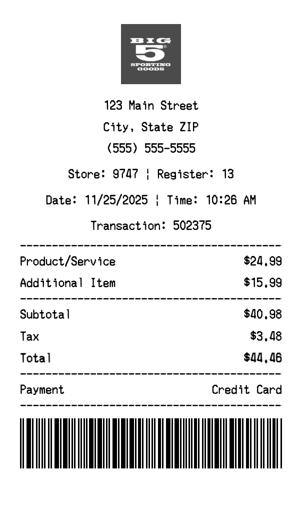 Create authentic Big 5 Sporting Goods receipts for sporting goods purchases. Our free receipt generator tool helps you create professional, detailed receipts instantly. Perfect for business expense tracking, reimbursement requests, and personal documentation. Download high-quality PNG receipts in seconds, no signup required.
