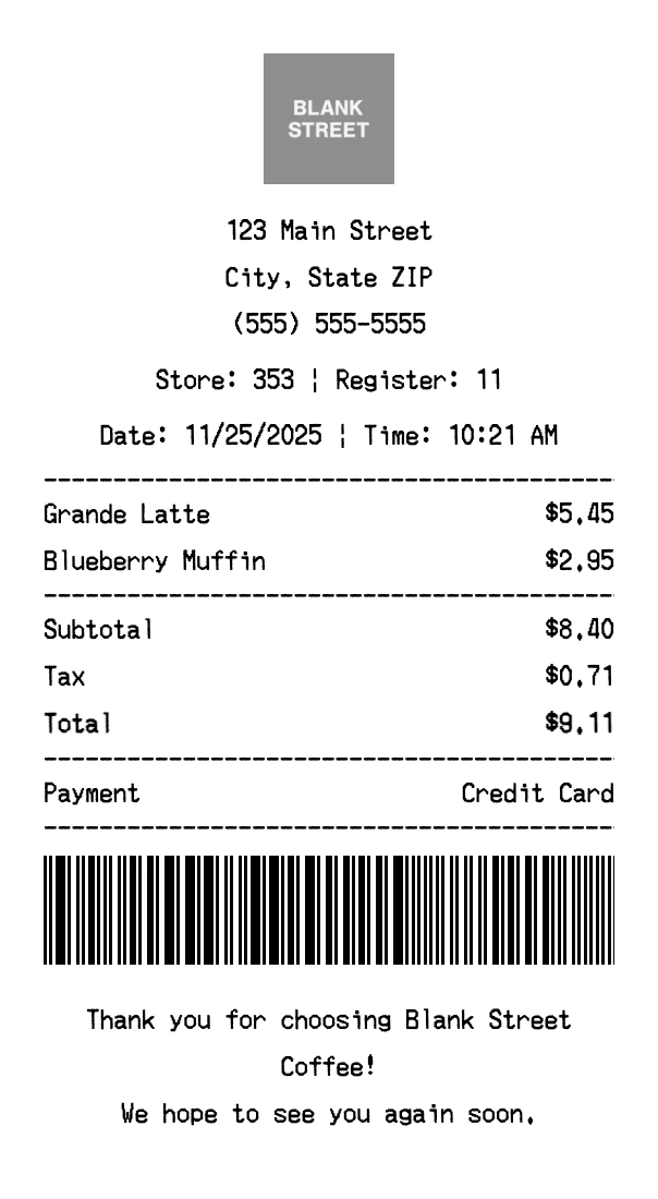 Use our free Blank Street Coffee Receipt Maker to create professional receipts in seconds.