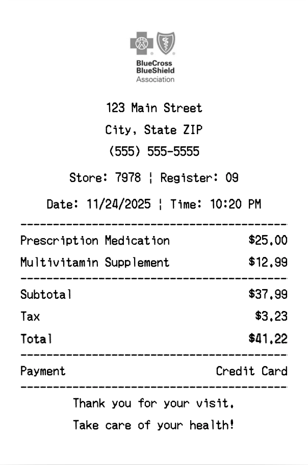 Create authentic Blue Cross Blue Shield receipts instantly. Our free receipt generator produces professional healthcare receipts with company logo, itemized purchases, tax calculations, and payment details. Perfect for expense tracking, reimbursement, and documentation. Download high-quality PNG receipts in seconds.