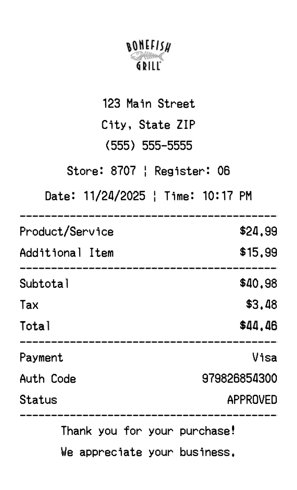 Create authentic Bonefish Grill receipts for casual dining purchases. Our free receipt generator tool helps you create professional, detailed receipts instantly. Perfect for business expense tracking, reimbursement requests, and personal documentation. Download high-quality PNG receipts in seconds, no signup required.