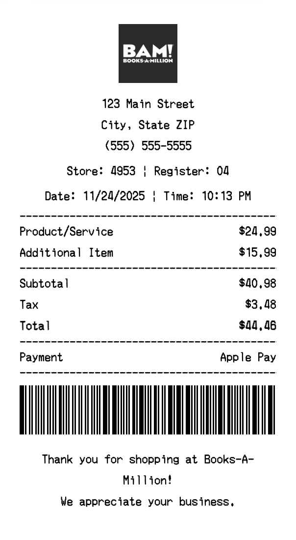 Create Books-A-Million Receipt