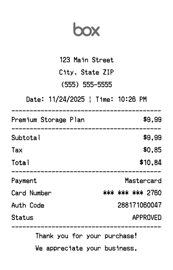 Create authentic Box receipts for cloud storage purchases. Our free receipt generator tool helps you create professional, detailed receipts instantly. Perfect for business expense tracking, reimbursement requests, and personal documentation. Download high-quality PNG receipts in seconds, no signup required.