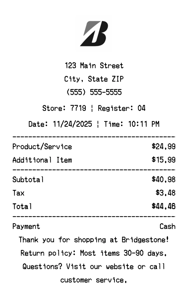 Create authentic Bridgestone receipts for automotive service purchases. Our free receipt generator tool helps you create professional, detailed receipts instantly. Perfect for business expense tracking, reimbursement requests, and personal documentation. Download high-quality PNG receipts in seconds, no signup required.
