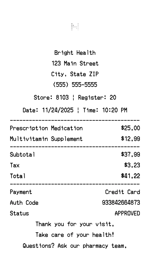 Create authentic Bright Health receipts instantly. Our free receipt generator produces professional healthcare receipts with company logo, itemized purchases, tax calculations, and payment details. Perfect for expense tracking, reimbursement, and documentation. Download high-quality PNG receipts in seconds.
