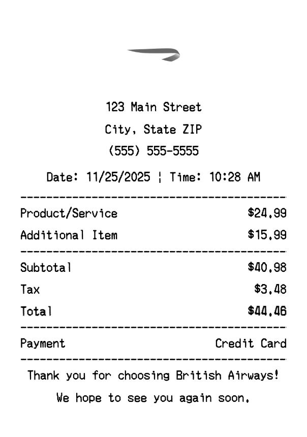 Create authentic British Airways receipts instantly. Our free receipt generator produces professional airlines receipts with company logo, itemized purchases, tax calculations, and payment details. Perfect for expense tracking, reimbursement, and documentation. Download high-quality PNG receipts in seconds.