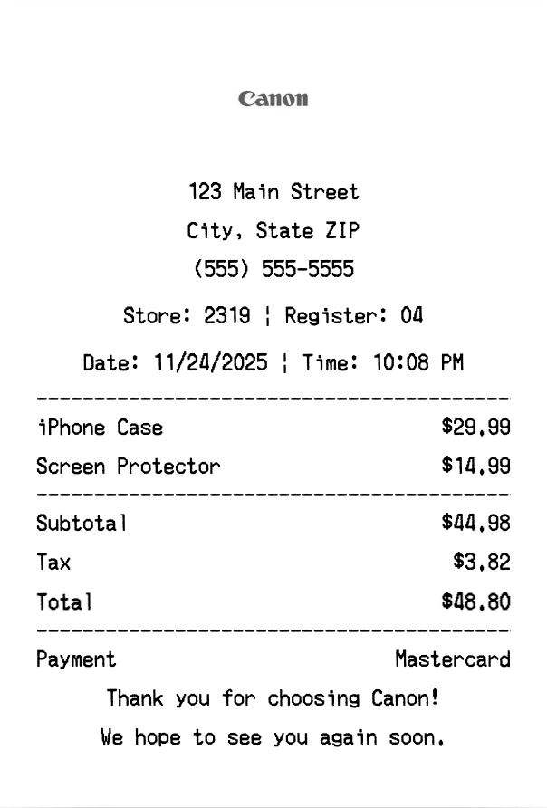 Create authentic Canon receipts instantly. Our free receipt generator produces professional technology receipts with company logo, itemized purchases, tax calculations, and payment details. Perfect for expense tracking, reimbursement, and documentation. Download high-quality PNG receipts in seconds.