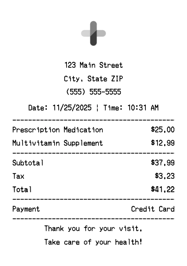Create authentic Capsule Pharmacy receipts instantly. Our free receipt generator produces professional pharmacy receipts with company logo, itemized purchases, tax calculations, and payment details. Perfect for expense tracking, reimbursement, and documentation. Download high-quality PNG receipts in seconds.