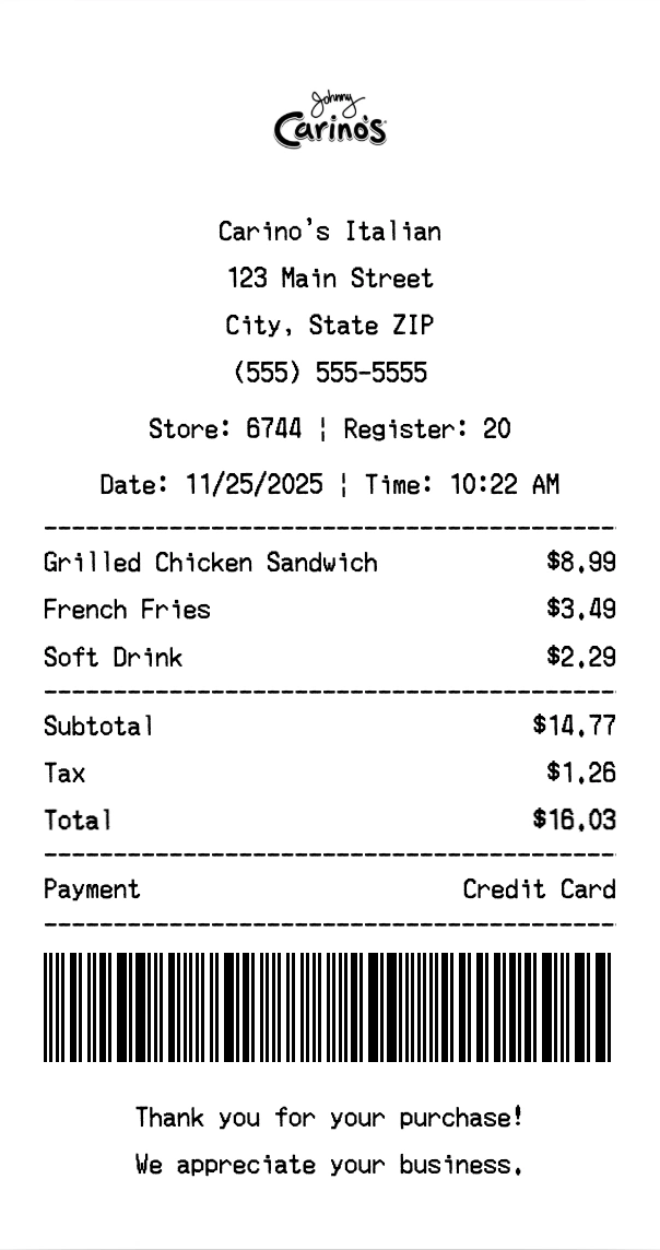 Create authentic Carino's Italian receipts for casual dining purchases. Our free receipt generator tool helps you create professional, detailed receipts instantly. Perfect for business expense tracking, reimbursement requests, and personal documentation. Download high-quality PNG receipts in seconds, no signup required.