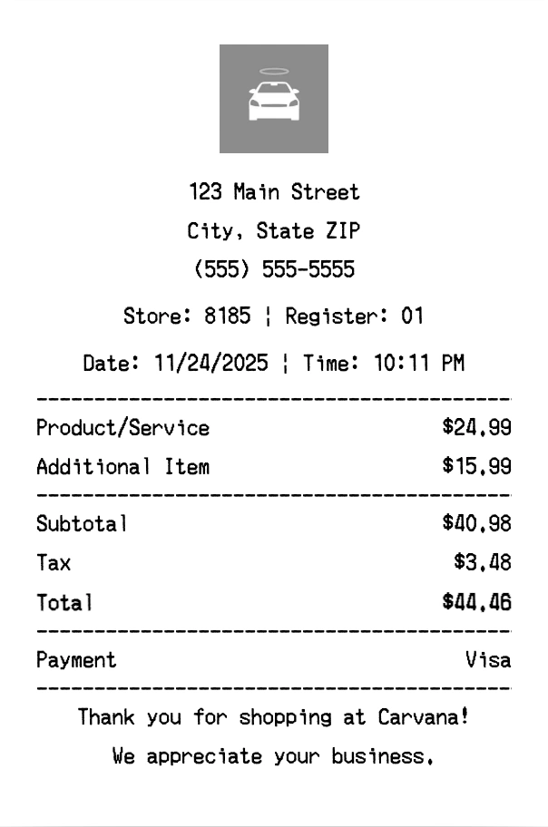 Create authentic Carvana receipts instantly. Our free receipt generator produces professional automotive sales receipts with company logo, itemized purchases, tax calculations, and payment details. Perfect for expense tracking, reimbursement, and documentation. Download high-quality PNG receipts in seconds.