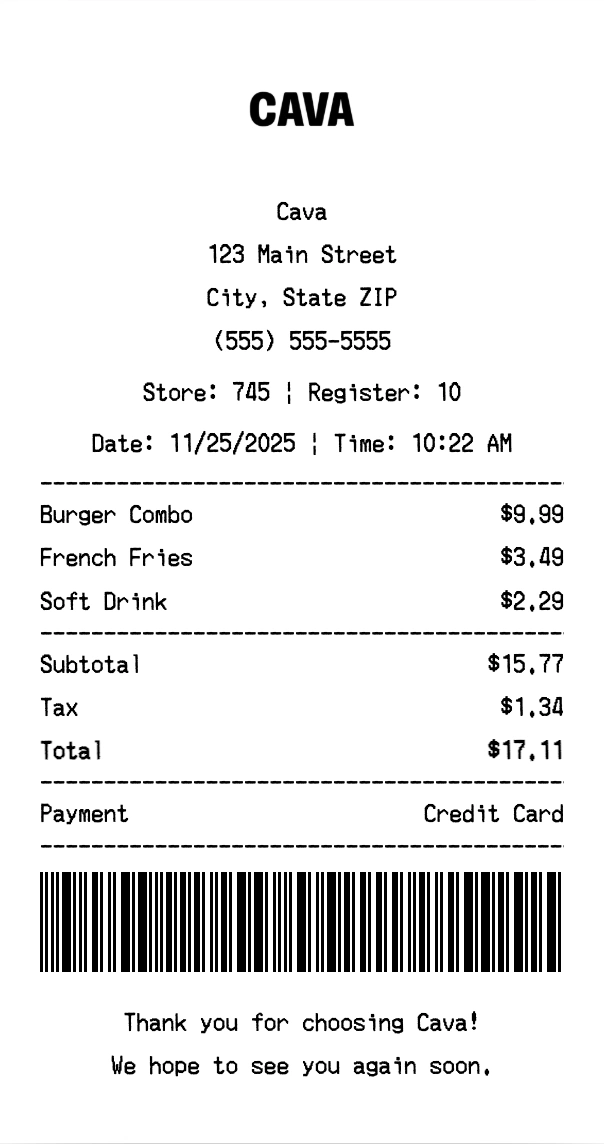 Create authentic Cava receipts instantly. Our free receipt generator produces professional fast casual receipts with company logo, itemized purchases, tax calculations, and payment details. Perfect for expense tracking, reimbursement, and documentation. Download high-quality PNG receipts in seconds.