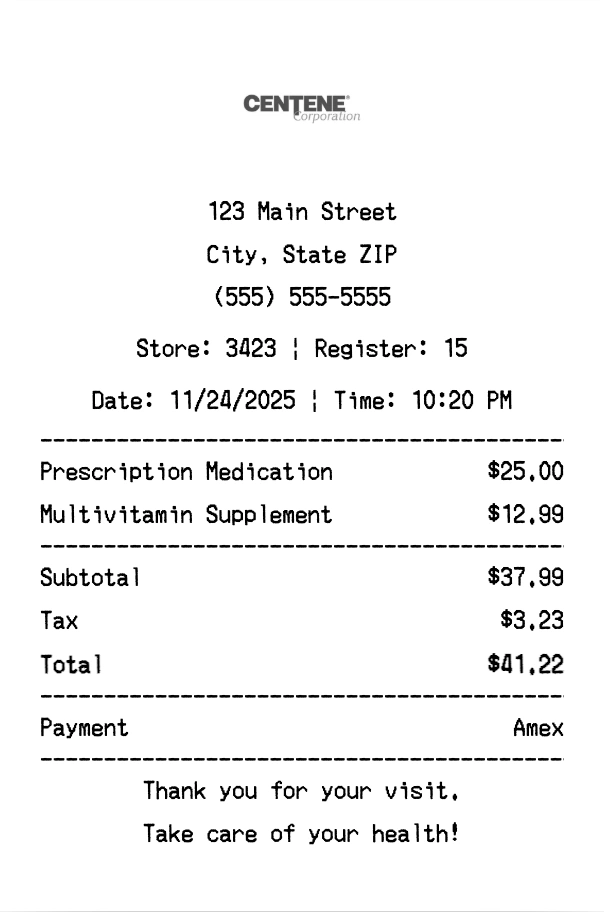 Create authentic Centene receipts for healthcare purchases. Our free receipt generator tool helps you create professional, detailed receipts instantly. Perfect for business expense tracking, reimbursement requests, and personal documentation. Download high-quality PNG receipts in seconds, no signup required.