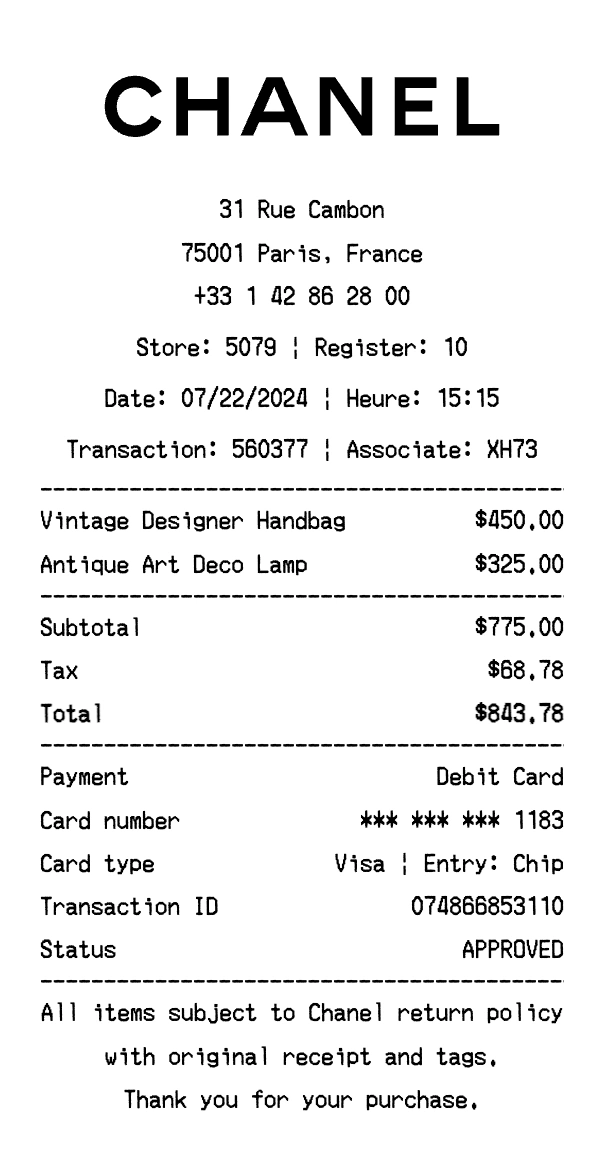 Create authentic Chanel receipts for fashion & luxury purchases. Our free receipt generator tool helps you create professional, detailed receipts instantly. Perfect for business expense tracking, reimbursement requests, and personal documentation. Download high-quality PNG receipts in seconds, no signup required.