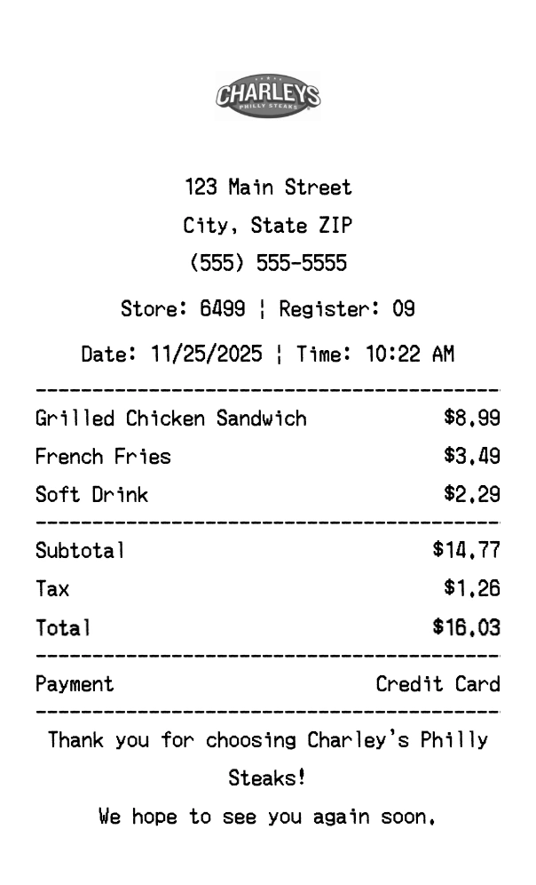 Create authentic Charley's Philly Steaks receipts for fast food purchases. Our free receipt generator tool helps you create professional, detailed receipts instantly. Perfect for business expense tracking, reimbursement requests, and personal documentation. Download high-quality PNG receipts in seconds, no signup required.