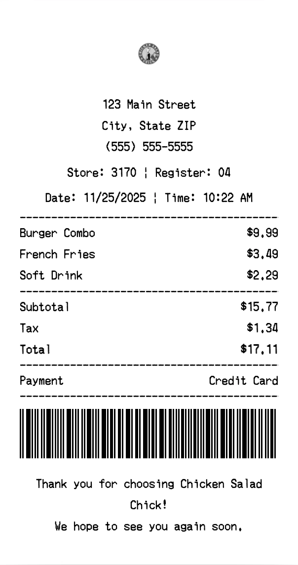 Create authentic Chicken Salad Chick receipts instantly. Our free receipt generator produces professional fast casual receipts with company logo, itemized purchases, tax calculations, and payment details. Perfect for expense tracking, reimbursement, and documentation. Download high-quality PNG receipts in seconds.
