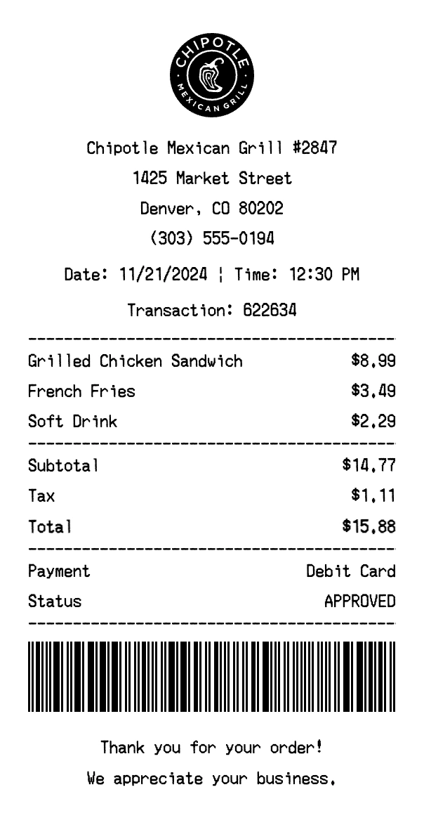 Create authentic Chipotle receipts for food & beverage purchases. Our free receipt generator tool helps you create professional, detailed receipts instantly. Perfect for business expense tracking, reimbursement requests, and personal documentation. Download high-quality PNG receipts in seconds, no signup required.