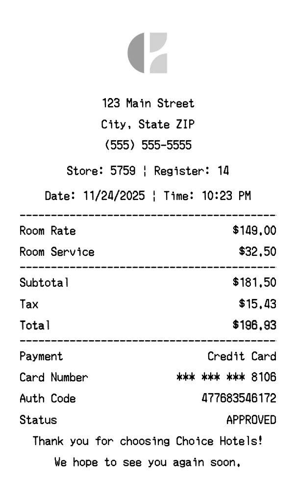 Create authentic Choice Hotels receipts instantly. Our free receipt generator produces professional hotel receipts with company logo, itemized purchases, tax calculations, and payment details. Perfect for expense tracking, reimbursement, and documentation. Download high-quality PNG receipts in seconds.