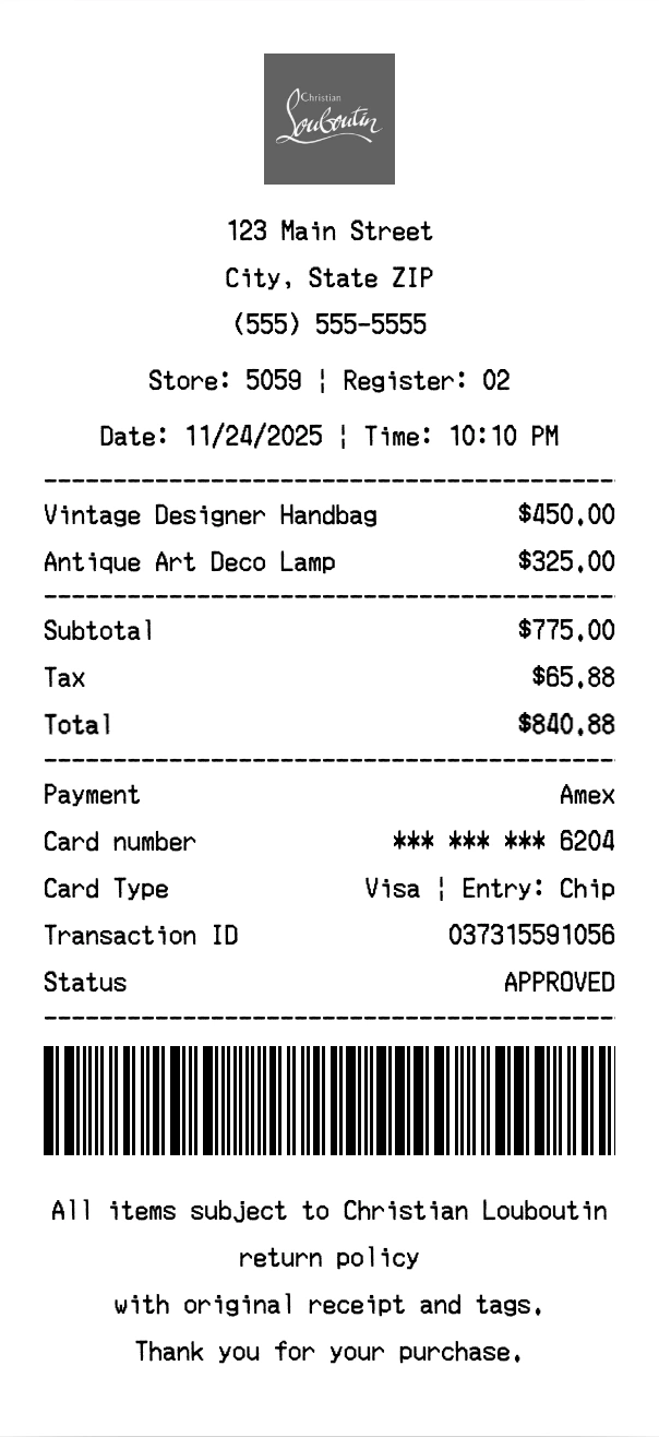 Create authentic Christian Louboutin receipts for luxury fashion purchases. Our free receipt generator tool helps you create professional, detailed receipts instantly. Perfect for business expense tracking, reimbursement requests, and personal documentation. Download high-quality PNG receipts in seconds, no signup required.