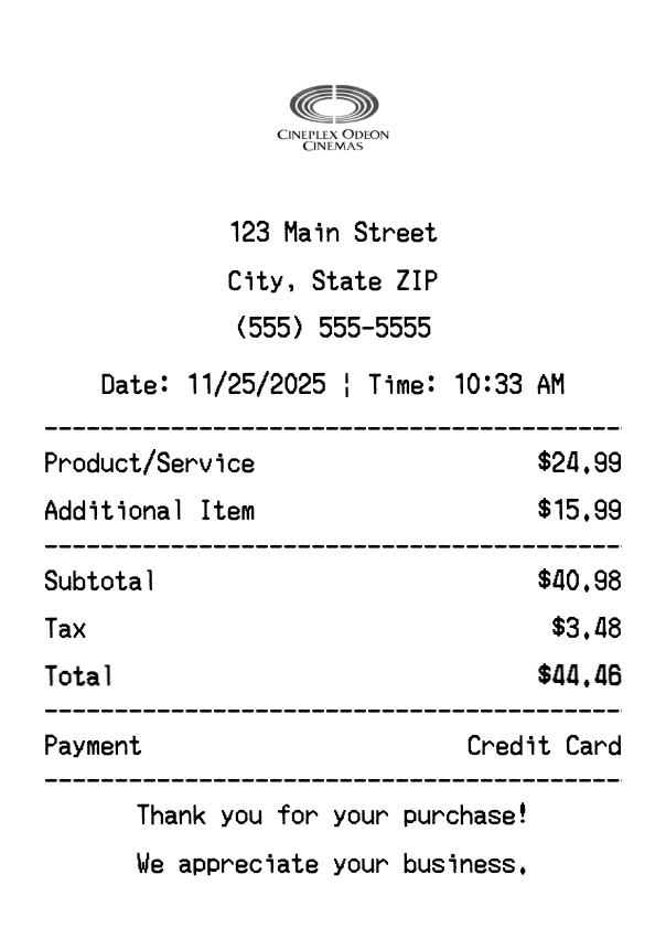 Create authentic Cineplex receipts instantly. Our free receipt generator produces professional cinema receipts with company logo, itemized purchases, tax calculations, and payment details. Perfect for expense tracking, reimbursement, and documentation. Download high-quality PNG receipts in seconds.