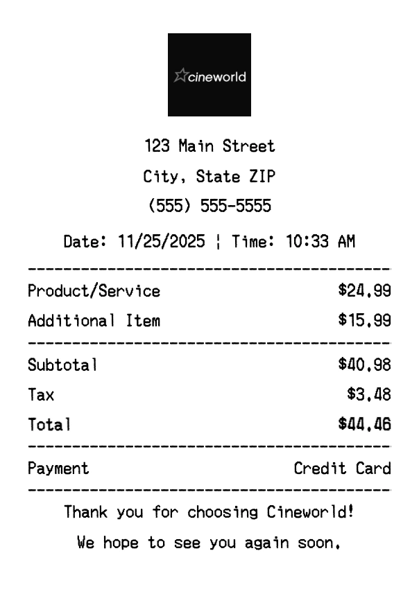 Create authentic Cineworld receipts instantly. Our free receipt generator produces professional cinema receipts with company logo, itemized purchases, tax calculations, and payment details. Perfect for expense tracking, reimbursement, and documentation. Download high-quality PNG receipts in seconds.