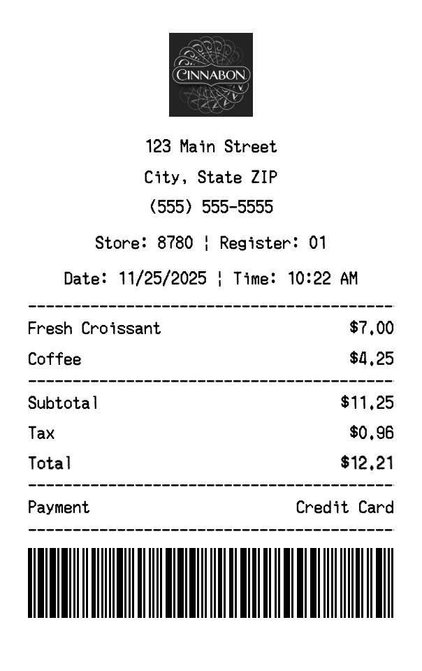 Create authentic Cinnabon receipts for bakery purchases. Our free receipt generator tool helps you create professional, detailed receipts instantly. Perfect for business expense tracking, reimbursement requests, and personal documentation. Download high-quality PNG receipts in seconds, no signup required.