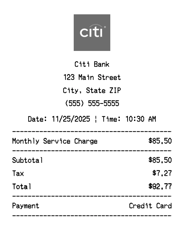 Create authentic Citi Bank receipts instantly. Our free receipt generator produces professional bank receipts with company logo, itemized purchases, tax calculations, and payment details. Perfect for expense tracking, reimbursement, and documentation. Download high-quality PNG receipts in seconds.