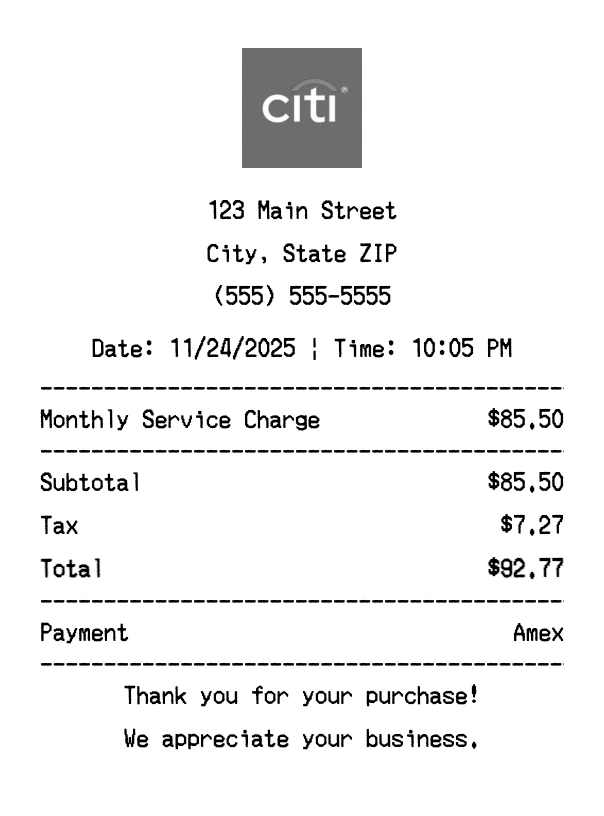 Create authentic Citigroup receipts instantly. Our free receipt generator produces professional financial services receipts with company logo, itemized purchases, tax calculations, and payment details. Perfect for expense tracking, reimbursement, and documentation. Download high-quality PNG receipts in seconds.