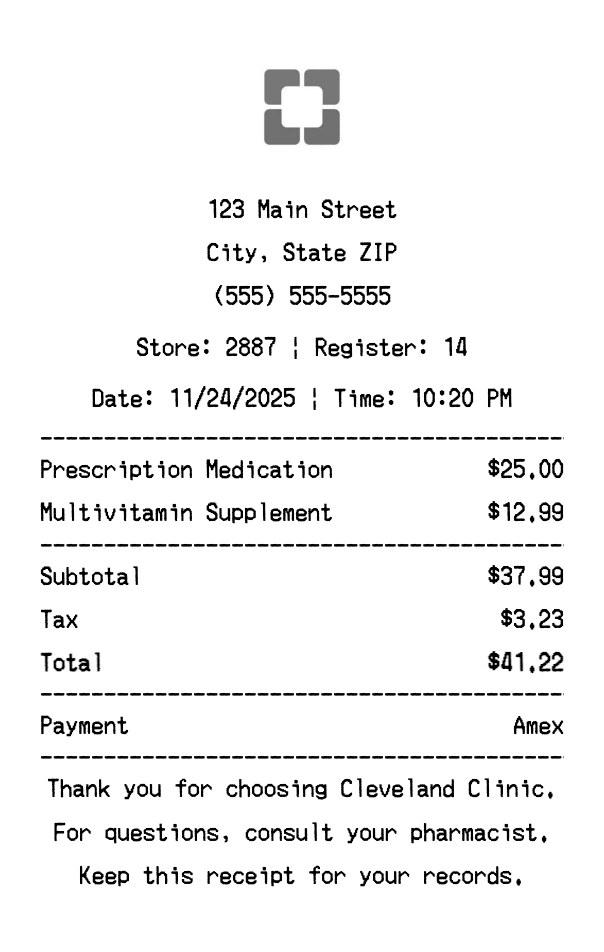 Create authentic Cleveland Clinic receipts for healthcare purchases. Our free receipt generator tool helps you create professional, detailed receipts instantly. Perfect for business expense tracking, reimbursement requests, and personal documentation. Download high-quality PNG receipts in seconds, no signup required.