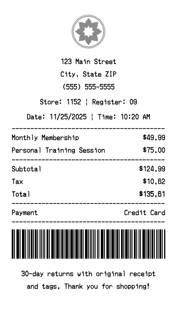 Create authentic Club Pilates receipts for fitness purchases. Our free receipt generator tool helps you create professional, detailed receipts instantly. Perfect for business expense tracking, reimbursement requests, and personal documentation. Download high-quality PNG receipts in seconds, no signup required.
